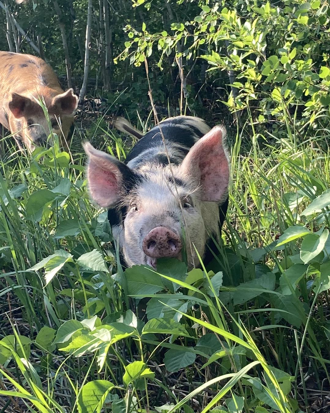 We have a lot of mature forest on our home quarter, and because we heat our house and shop with an outdoor wood boiler, we can selectively harvest trees to allow more light to reach the ground for a more productive forest. Pigs pair perfectly with this more open canopy by rooting around and disturbing the seed bank to allow new seedlings to take advantage of the increased light filtering through! They will be moved to a new paddock at least once per week, and will be supplemented with grain, seasonal wild mushrooms, and nuts and fruits, such as acorns, chokecherries, Saskatoons and apples, along with plenty of LOOP produce.Pigs have the innate need to explore, forage and root around! Here at Deer Meadow Farmacy, we let all our pigs express their natural behavours. This allows them to thrive and really be as, “happy as a pig in muck”. Being able to soak up the sun and have a very diverse diet does not only benefit our pigs. This positively affects the environmental health and our consumers health.I can’t express enough how passionate we are about the health of our environment, our animals and our consumers. If you feel the same passion, please sign up to receive all our updates!