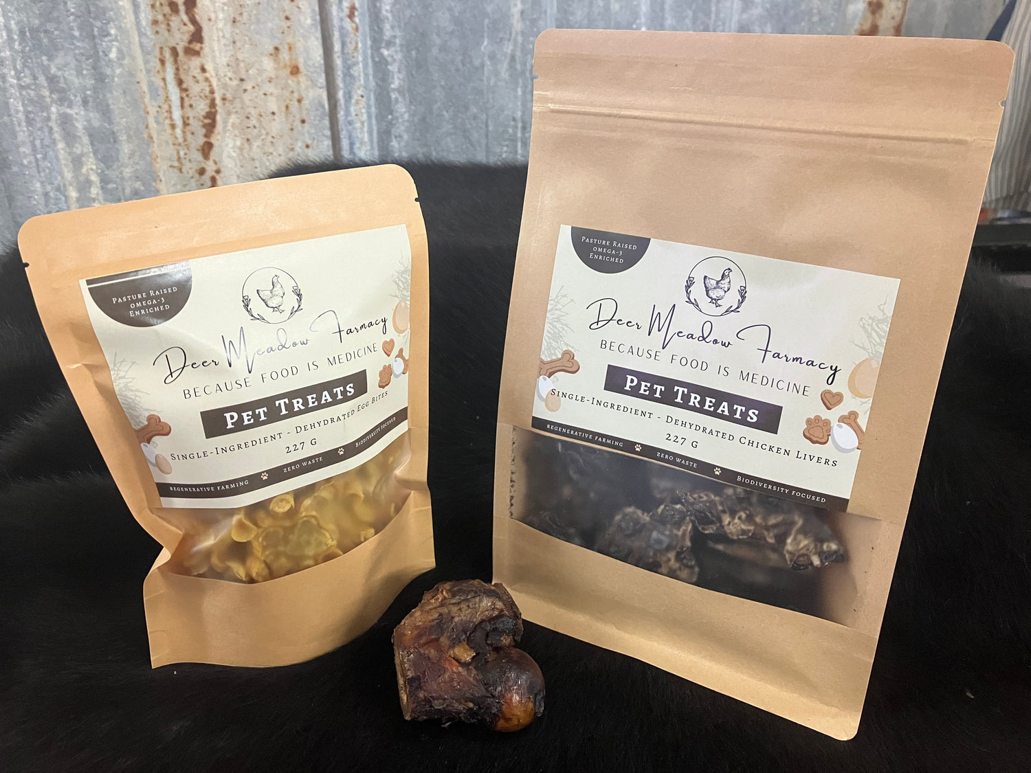 Our pet treats are very simple. The necks and feet are available frozen or dehydrated, and are just that; necks and feet, nothing else added. The same goes for our dehydrated egg treats and ground eggshells. They are all single ingredient products with nothing to hide.