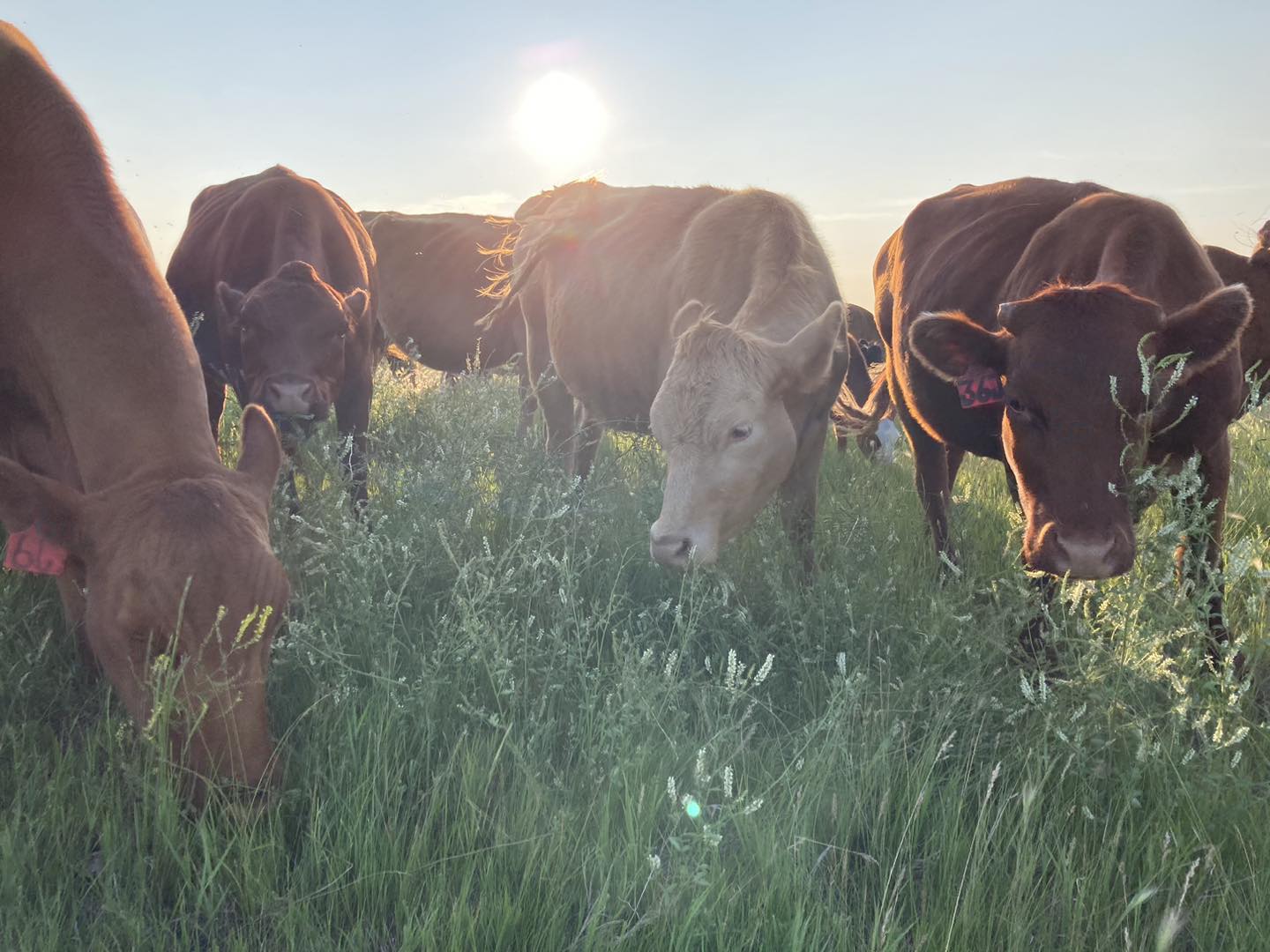 During their finishing period, they are moved to new grazing ground every day, sometimes multiple times per day, and are offered a veritable salad bar of fresh grasses, legumes and forbs, along with a limited amount of grain ration with milled flax for additional Omega-3 fats in the finished meat.